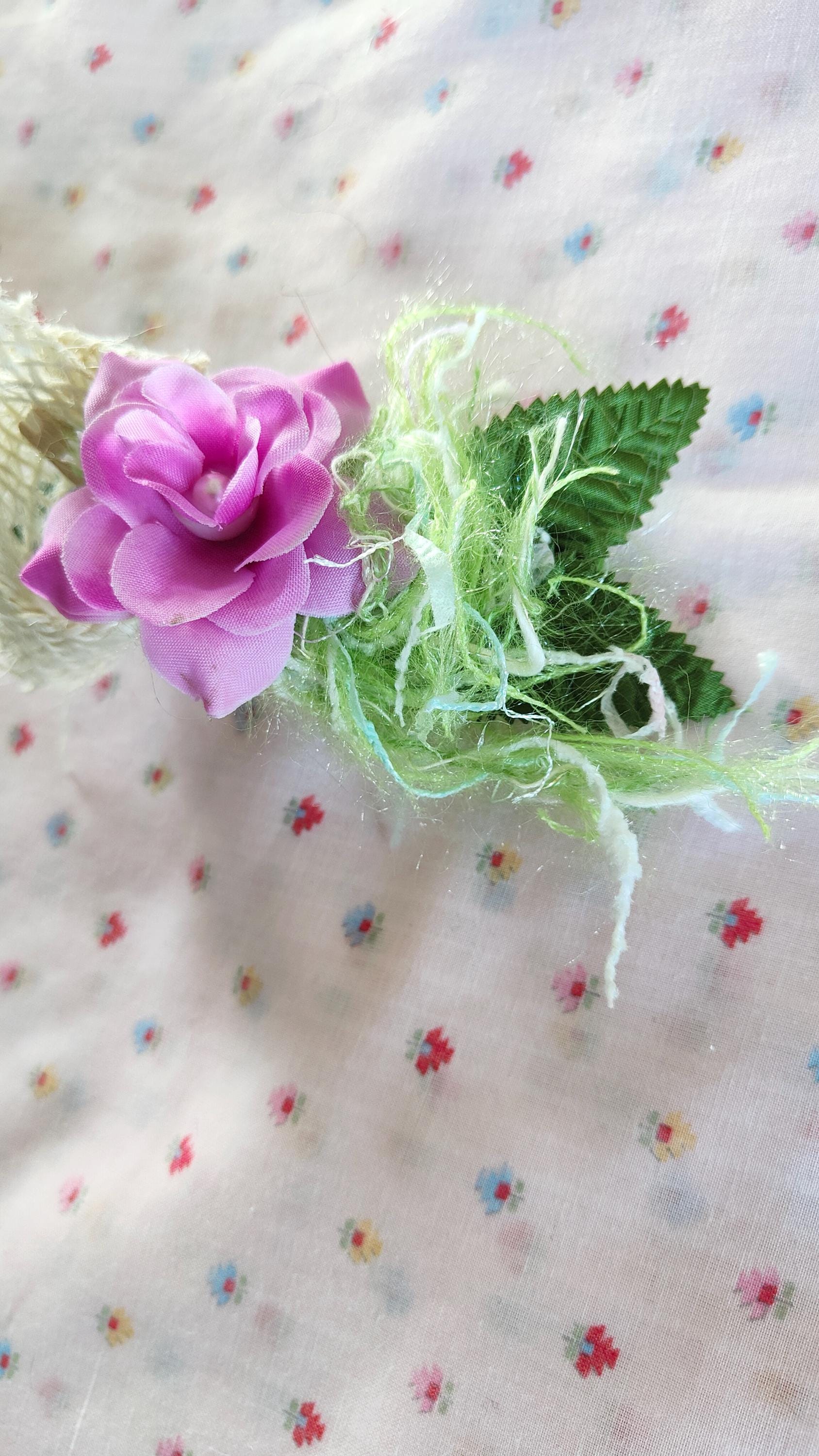 Composed of a delicate fabric flower, green leaf and a pretty natural canvas detail, this barrette evokes the spirit of romantic gardens and country weddings.